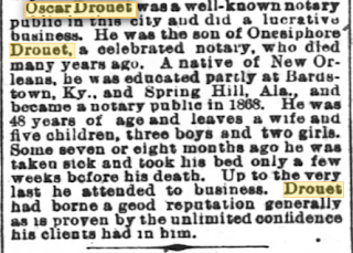 In April 1872, Drouet bought lot #111 and 113 Exchange Alley in New Orleans (which became Square 39, 407-409 Exchange Alley). He used this as his office. According to the Vieux Carré Digital Survey, Drouet paid $2825 for the plot of land. He transferred the land to Celeste Drouet for $2500 in June 1879. She in turn transferred the land to Peter Tudury in July 1881. Peter, also known as Pierre Tudury, was the son of Antonio Tudury (brother of Raphael Tudury). He transferred the land back to Oscar Drouet in September 1881. In February 1890, Drouet sold the land to Dorothea Paderas. She kept the land until her death in March 1900. After becoming the successor to Dorothea's estate, her daughter Martina Antoinette Tudury sold the land to Paul Rousset for $1100 in April 1900. Rousset sold the land to the City of New Orleans in June 1903. A photo of the building now on the land is below: